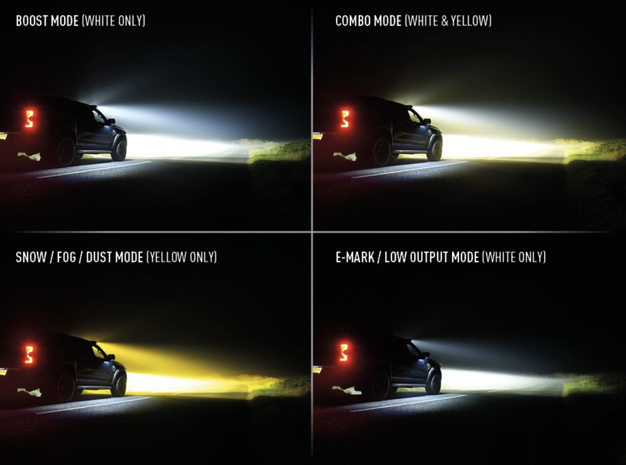 האורות נועדו לעבור דרך מצבי התאורה השונים באמצעות מתג רגעי. מצבי התאורה הם: Boost (לבן בלבד), Combo (לבן + צהוב), מצב שלג/ערפל/אבק (צהוב בלבד), ו-E-mark (לבן בלבד; חוקי לכביש בתפוקה מופחתת תואם ל-UNECE Reg 149). פונקציית זיכרון בתוך המנורה פירושה שהמצב הקודם שנבחר יהיה בתוקף כאשר הרכב שלך יופעל מחדש, למשל. בנוסף, לחיצה ממושכת על המתג הרגעי למשך 2 שניות תגרום לקפיצה מיידית של האור למצב E-mark.