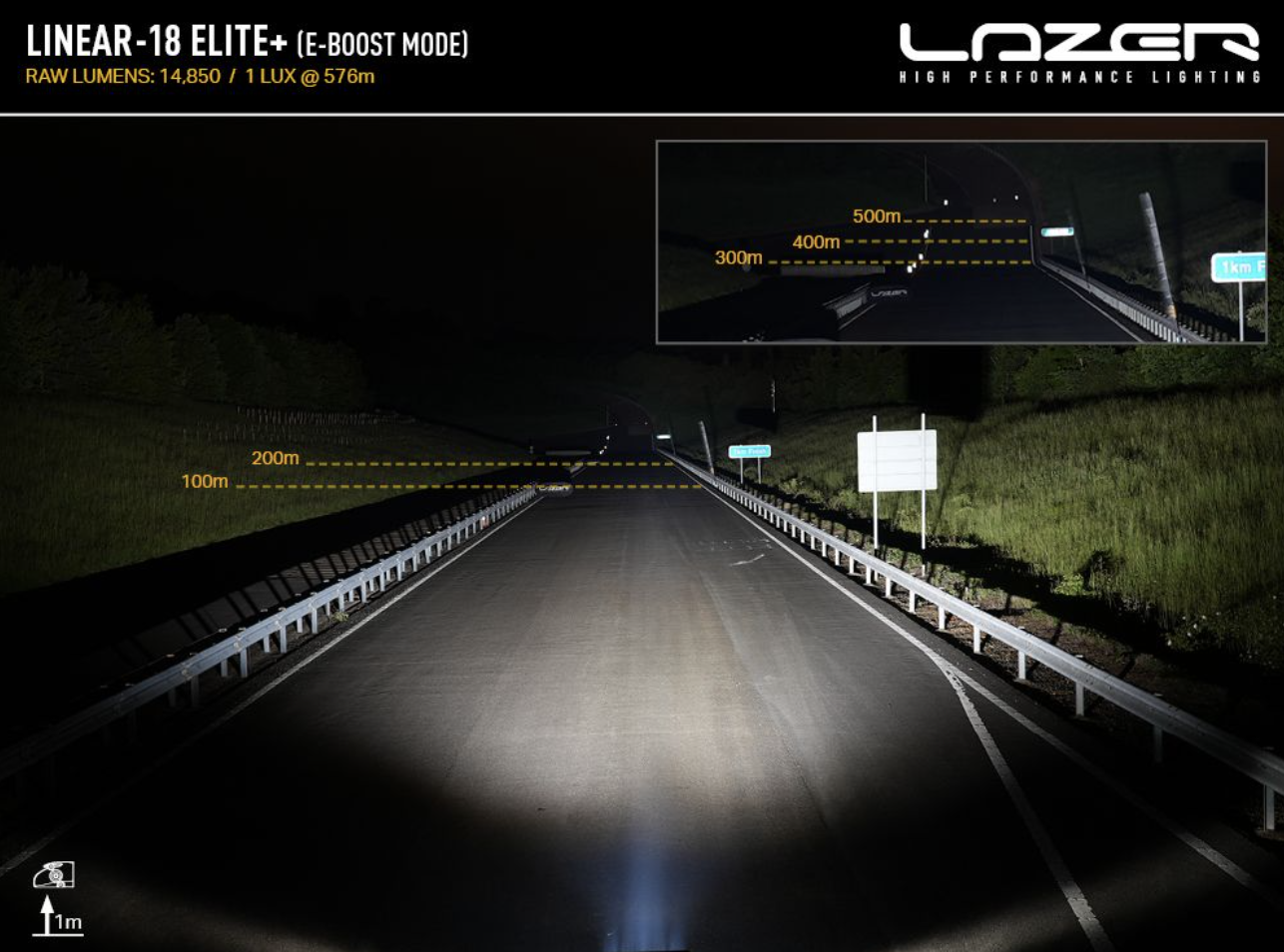 למרות העיצוב האווירי בעל הפרופיל הנמוך של ה-Linear-18 Elite+, באמצעות עיצוב אלקטרוני מתקדם האור מורכב מ-36 לדים לבנים מרשימים ו-18 לדים צהובים. כאשר האור פועל במצב Boost, נוריות הלד הלבנות מייצרות 14,850 לומן גולמי (10% יותר מה-Linear-18 Elite הנוכחי). מעבר למצב 'קומבו' נוריות הלד הלבנות והצהובות משתלבות כדי לייצר 21,000 לומן גולמי המייצגים ביצועי תאורה מדהימים עבור פס תאורה LED בגודלו. כל נוריות ה-LED הפועלות בשילוב מביאות לצריכת חשמל של 190W וצריכת זרם של 14 אמפר (ב-14V). כדי לתמוך בהפעלת המנורה וההתקנה החשמלית, כלולה ערכת חיווט מסופקת עם מחבר Aptiv בעוצמה גבוהה.