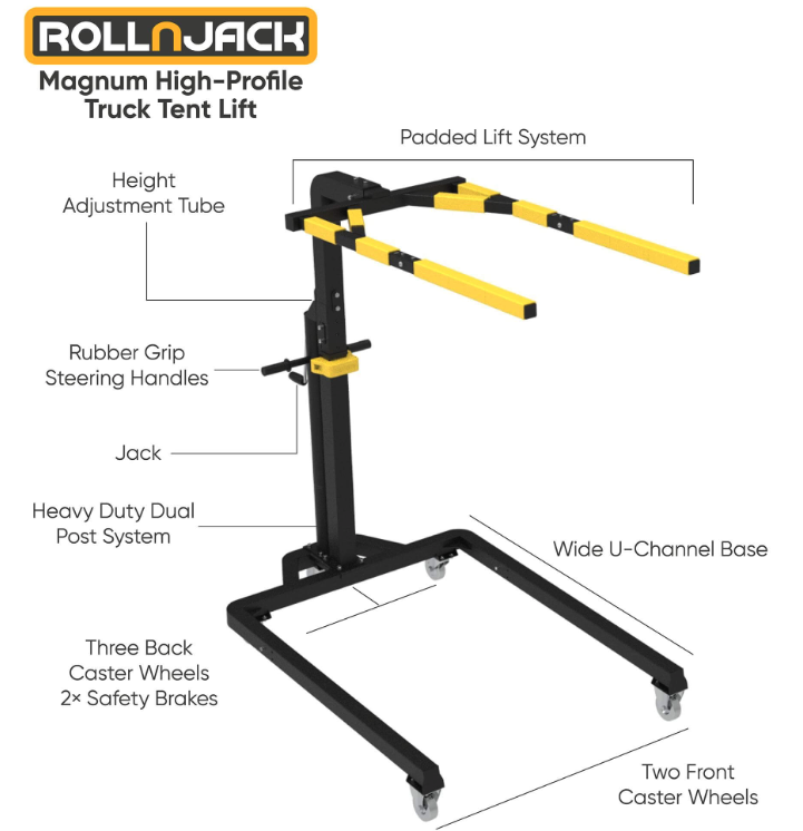 RollnJack Magnum היא מערכת הרמה ואחסון ייחודית, המיועדת לכל סוגי הרכבים – פרטיים, רכבי שטח, טנדרים ורכבי עבודה. המערכת מאפשרת למשתמש יחיד להרים, להסיר ולאחסן אוהלי גג וציוד כבד, ללא צורך בכלים מיוחדים או כוח אדם נוסף.